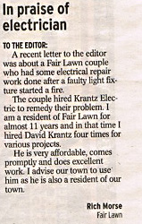 “I was so happy to have had a true professional come and do work for me! I asked Mr. Krantz for an estimate on some work that needed to be done in my home. He arrived promptly and was extremely courteous. He was very fair with his pricing and we began the work. In less time than he estimated, the work was complete! He was neat and clean leaving me almost nothing to pick up. I would certainly recommend Mr. Krantz for any electrical job you need, whether large or small. It is rare these days to have an honest to goodness, capable man do work in your home. Thanks again!”